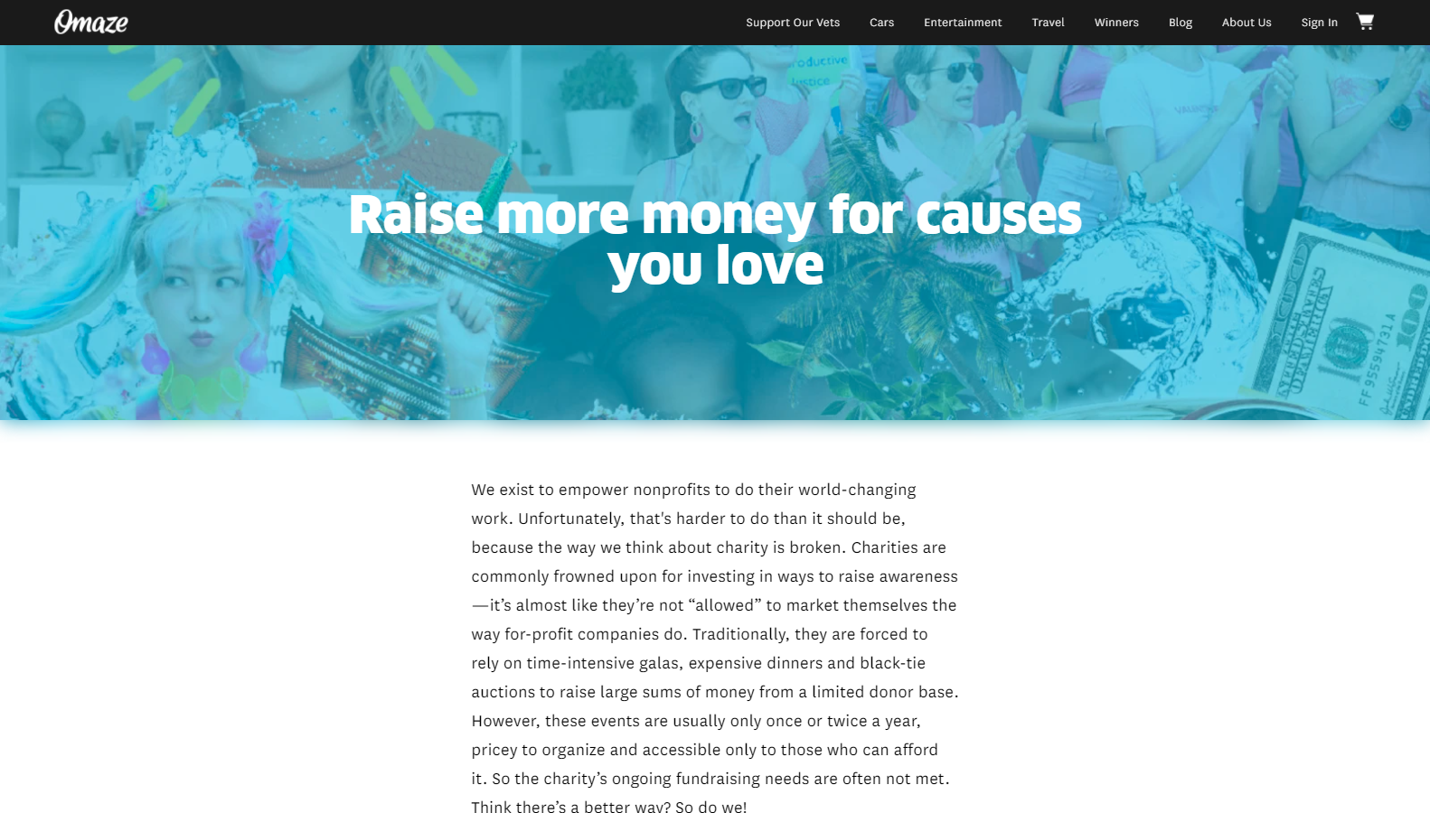 Omaze is a fund-raising company that offers donators a chance to have once-in-a-lifetime experiences like meeting or dating a celebrity, a dream vacation, cars, or tuition fees. They are a for-profit company so they take some percentage of every donation, taking some for marketing and then supporting charities with the majority of the funds.