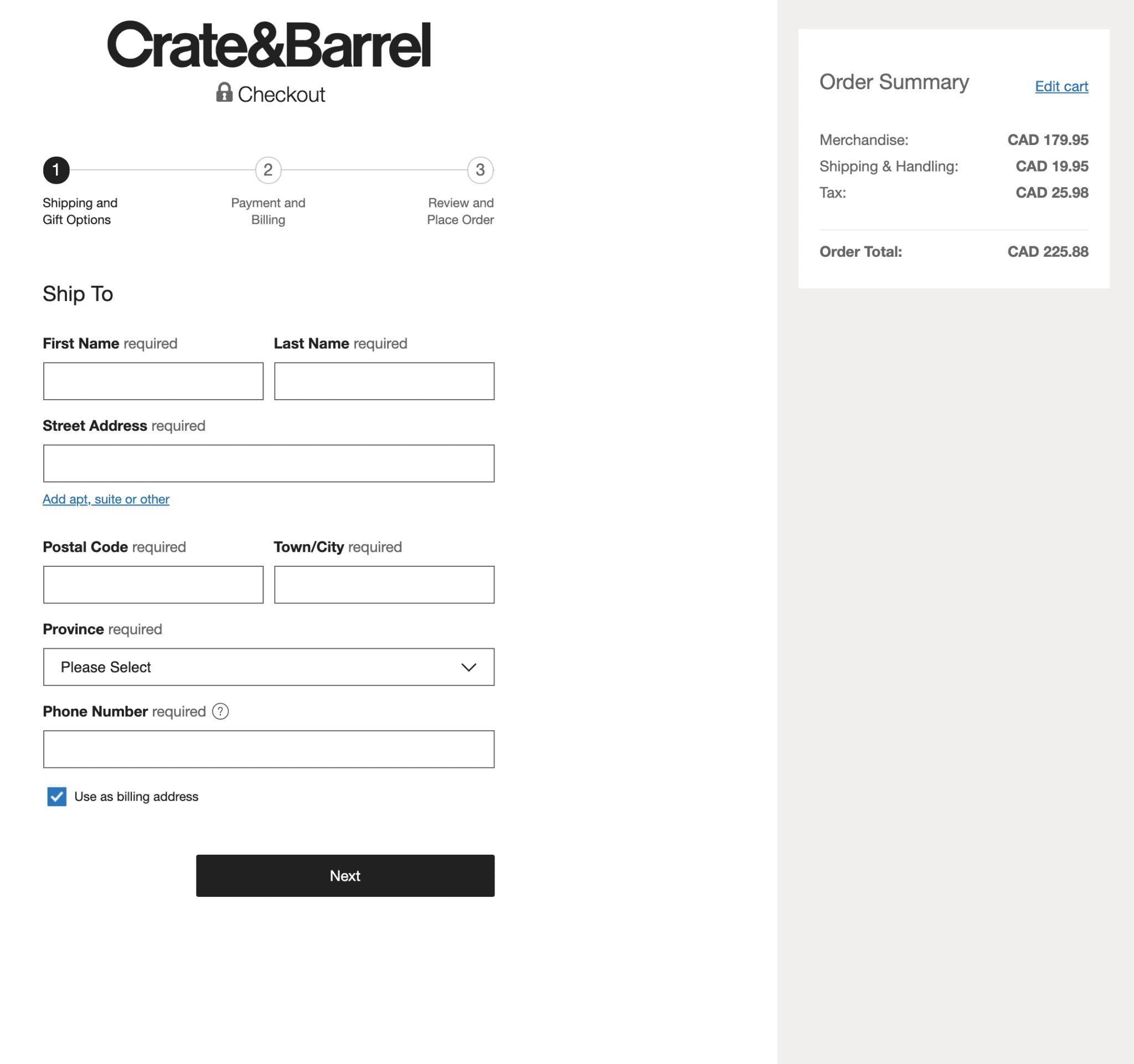 In this example from Crate&Barrel, they only have 3 steps in the whole checkout process and just 7 mandatory fields to be filled out. You can make this even shorter if you can automatically populate the City and Province (or state) fields once a user enters their Zip code. Doing so can make the form 2 fields shorter.