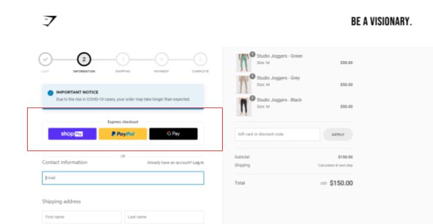 Too many stages in the checkout process are a typical reason for abandonment. The more steps required to complete a purchase, the more likely consumers are to become frustrated and leave. Using an express checkout method like Paypal, Google Pay, or Apple Pay reduces this risk.
