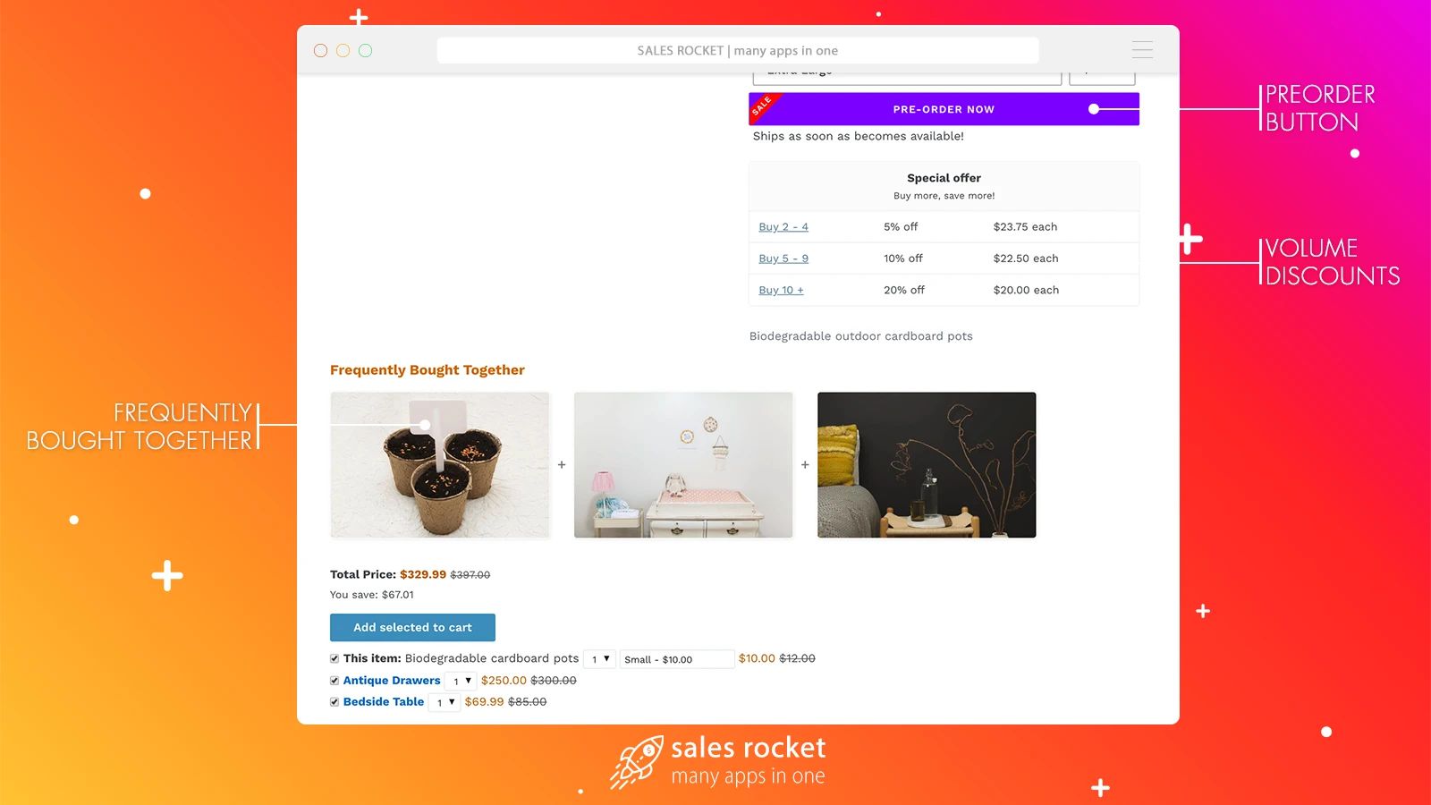 - Get better conversions and revenue: Volume discounts, Pre-Orders, Countdown Timer, Cart Reserved, Facebook Pixels, Stock Scarcity, Pop-ups, Shipping Information, and more are all accessible here.