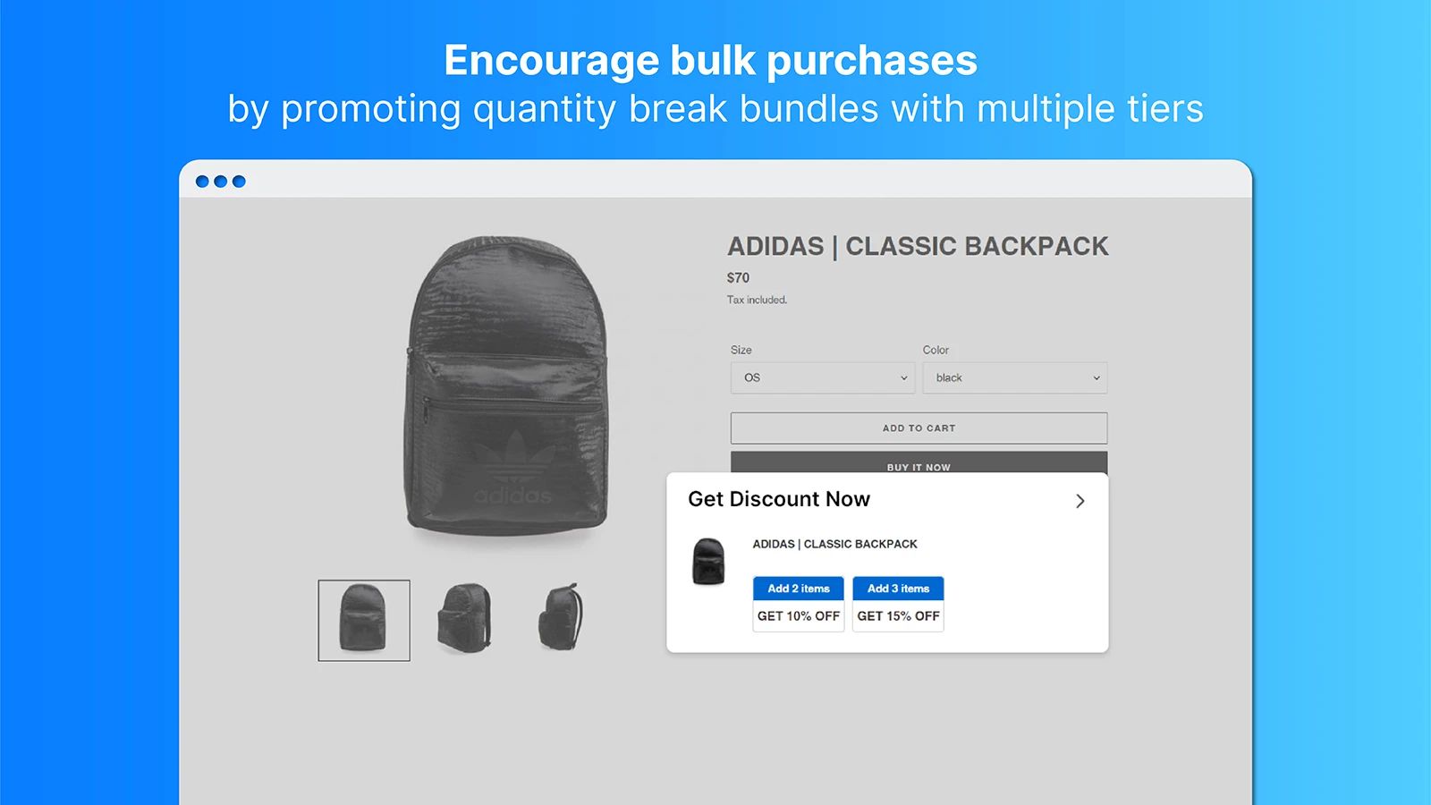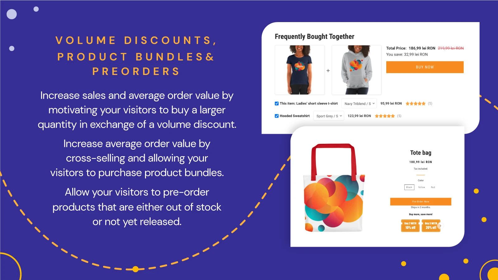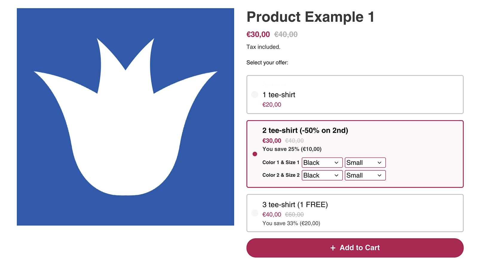 - Discounts and multiple variants available: Allow your customers to add more of the product with different variants for each by creating bundles, upsell and discountsundles, bundle products , volume discount and upsells to your customers.