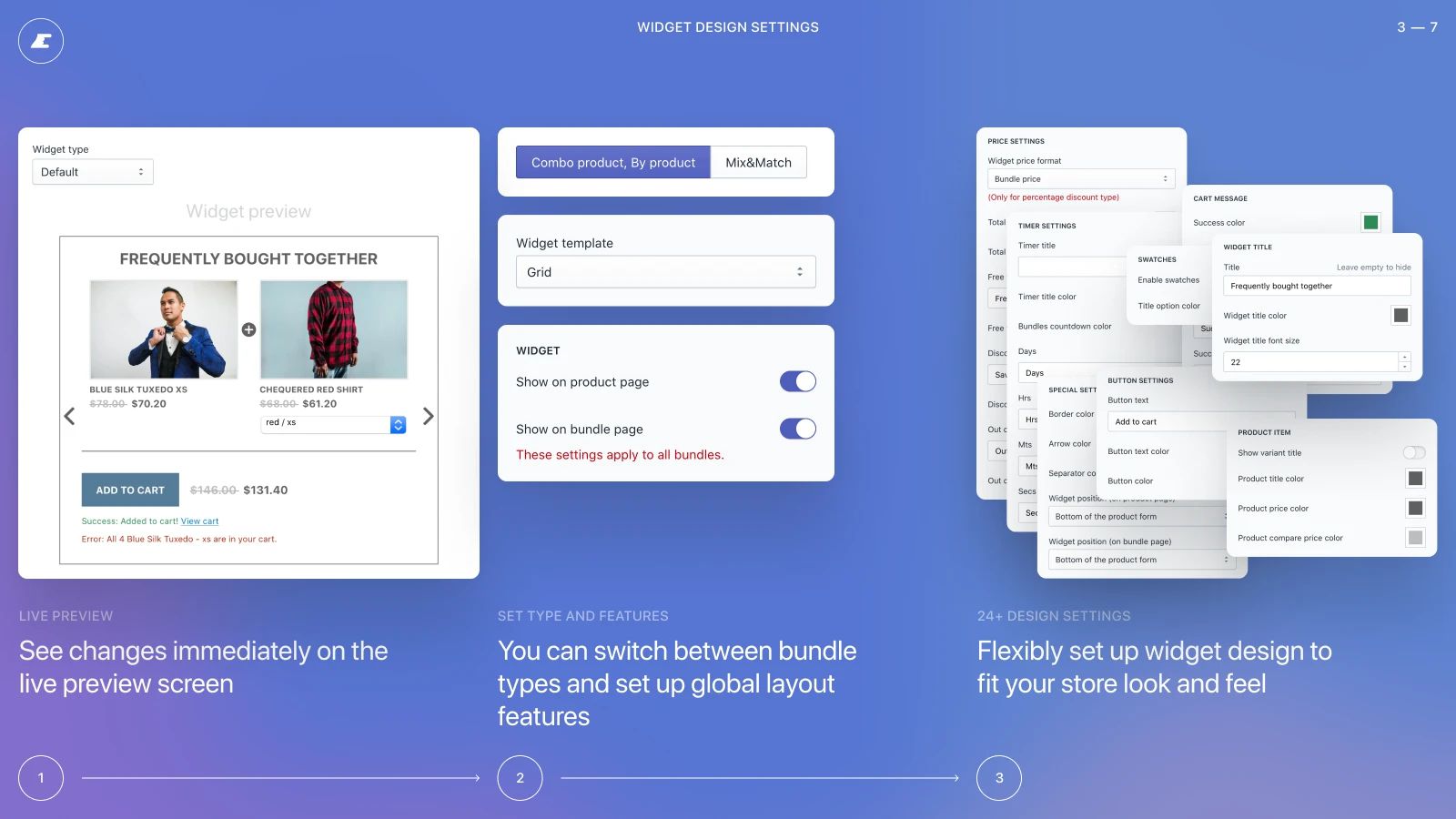 - Fully customizable: This app lets you have an unlimited number of bundles with the same product, set up a discount price or fixed price for every single bundled product, and lets you customize any part of the bundle widget