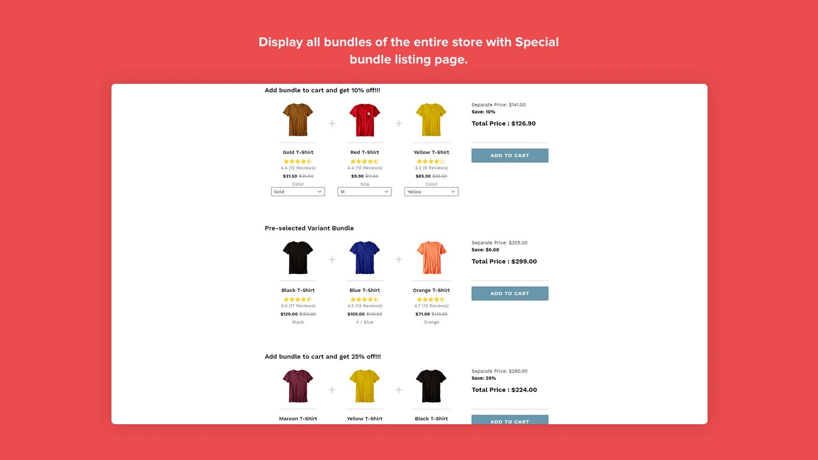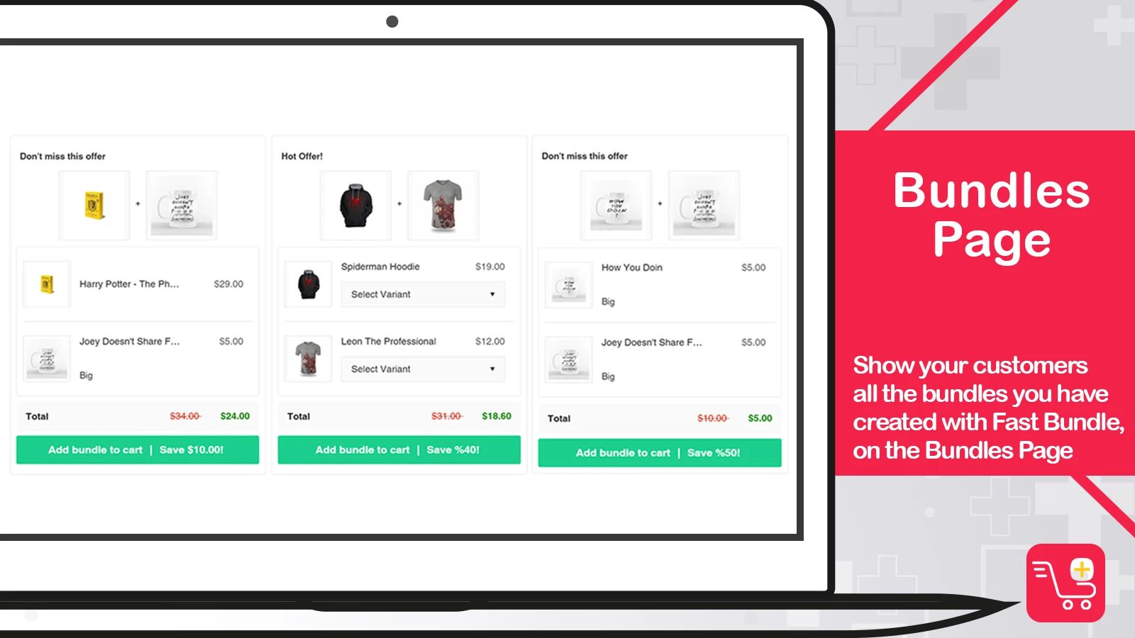 - Bundle Page: You may build a page that lists all of your store's custom bundles. Custom bundles may be added to the cart with one click.