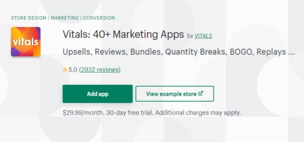 Vitals: 40+ is a powerful app that combines 40 applications into one, providing you access to about every feature you can imagine, including bundles. It allows you to provide discounted upsells and bulk discounts. For Shopify business owners who don't want to spend money on numerous applications, this is the software to use.