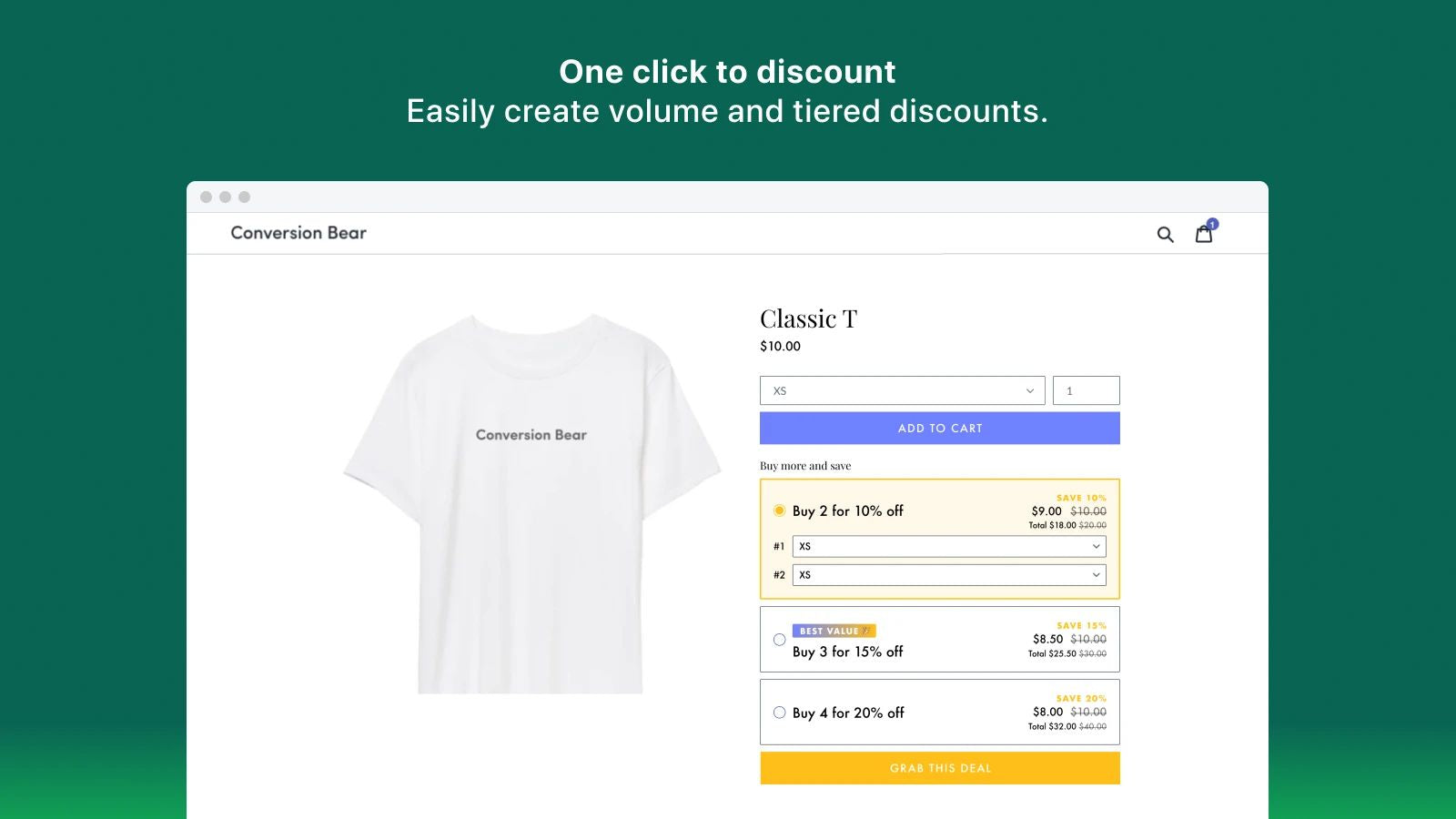 This app lets you create product tiers so discounts for five products and 10 products might be different. This helps you to reward consumers that buy in bulk and so offer you greater order values.