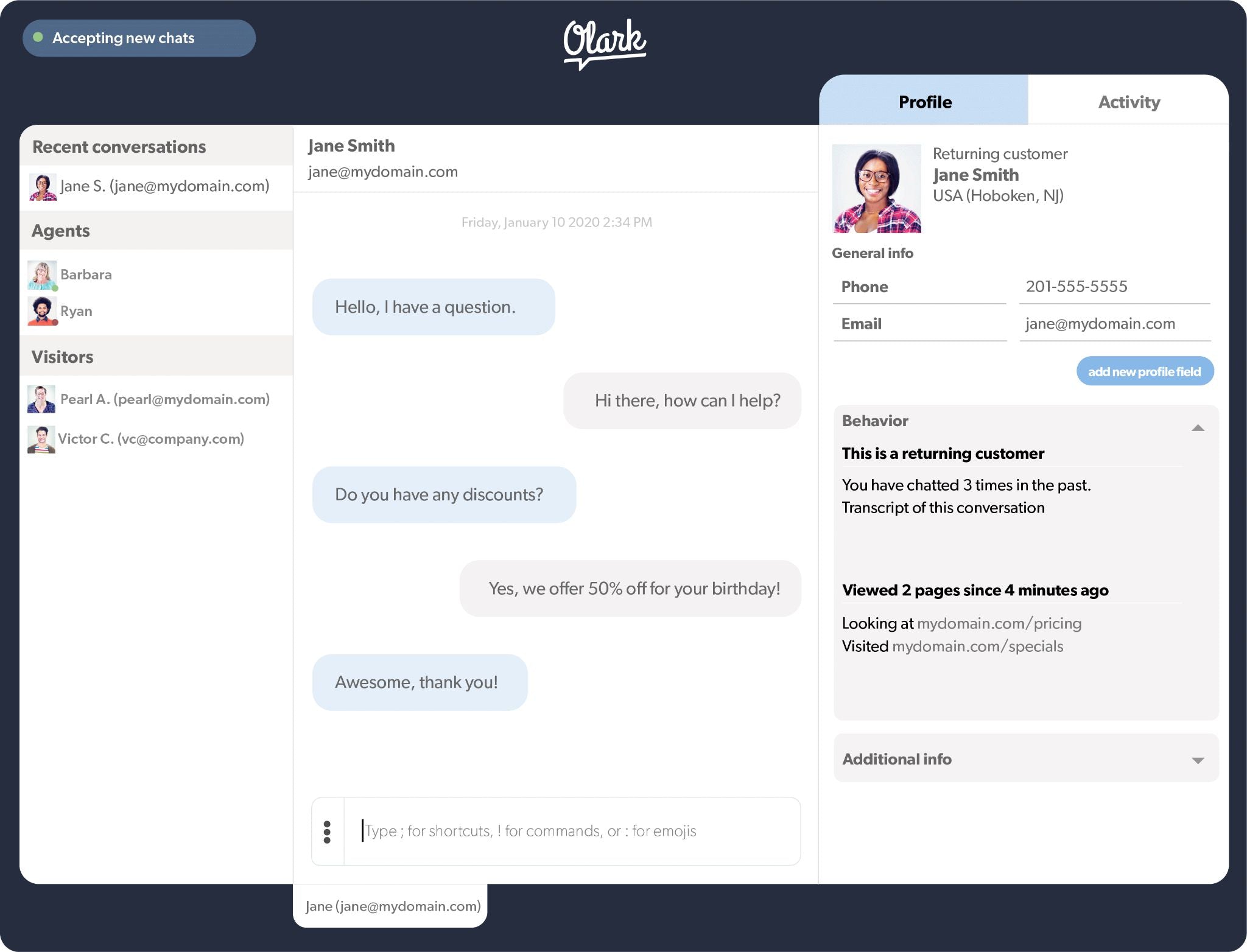 Olark makes it easy to support customers and answer sales questions right from your own website. Chat in real-time with shoppers using Google Talk or Jabber, send automatic email transcripts of your chat conversations, and escalate chats to a colleague if you need help. This is an excellent first-time live chat app. It just does the job plus it's simple to set up and is compatible with several chat platforms.