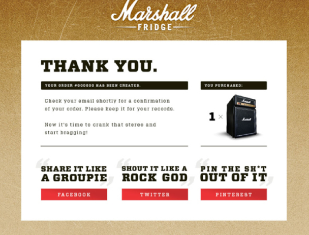 If your brand is more playful and creative however, your Thank You page should also reflect that. Here’s a great one from Marshall Fridge which matches how they think their customers talk or would be able to relate to while also encouraging them to share their purchase on social media.