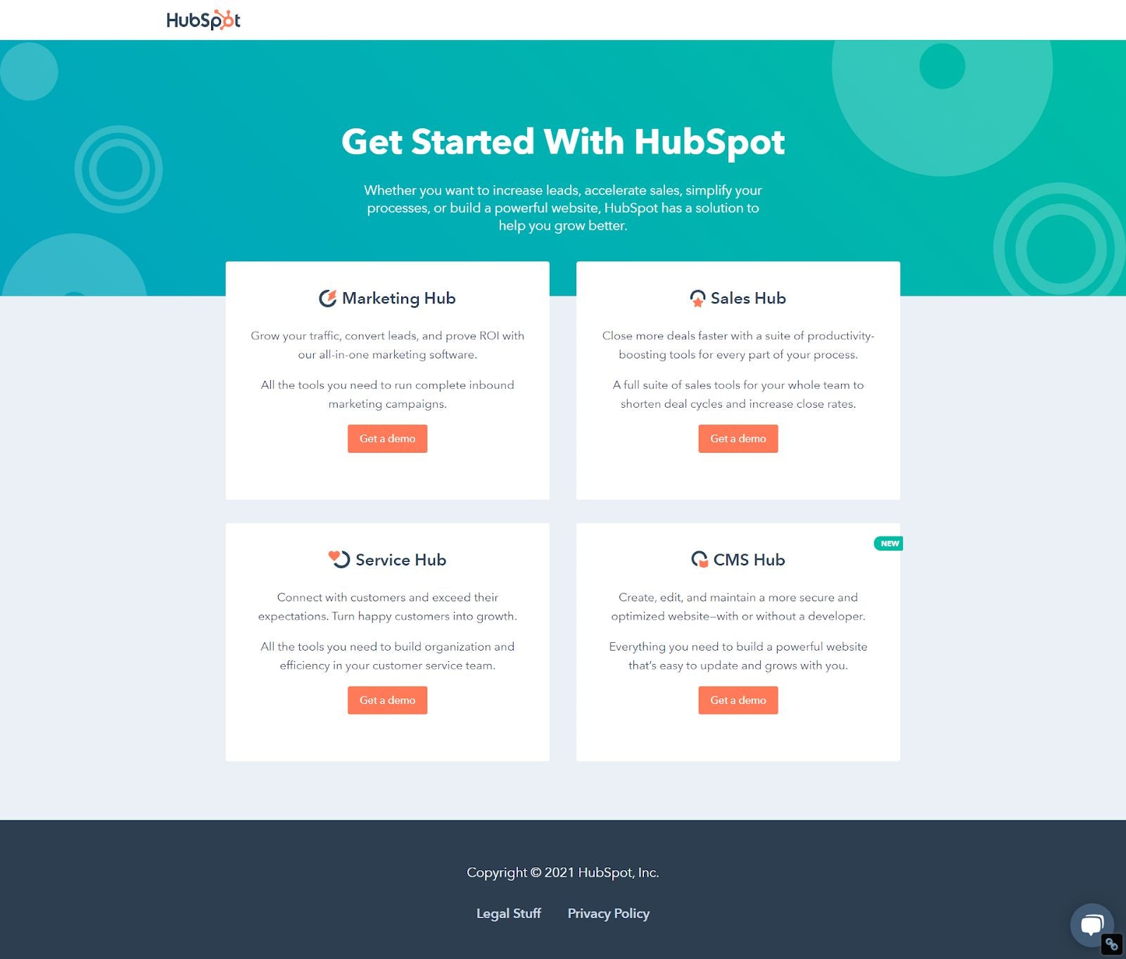 Example: Hubspot’s landing page which promotes particular offers with the goal of getting customers to sign up for the demo