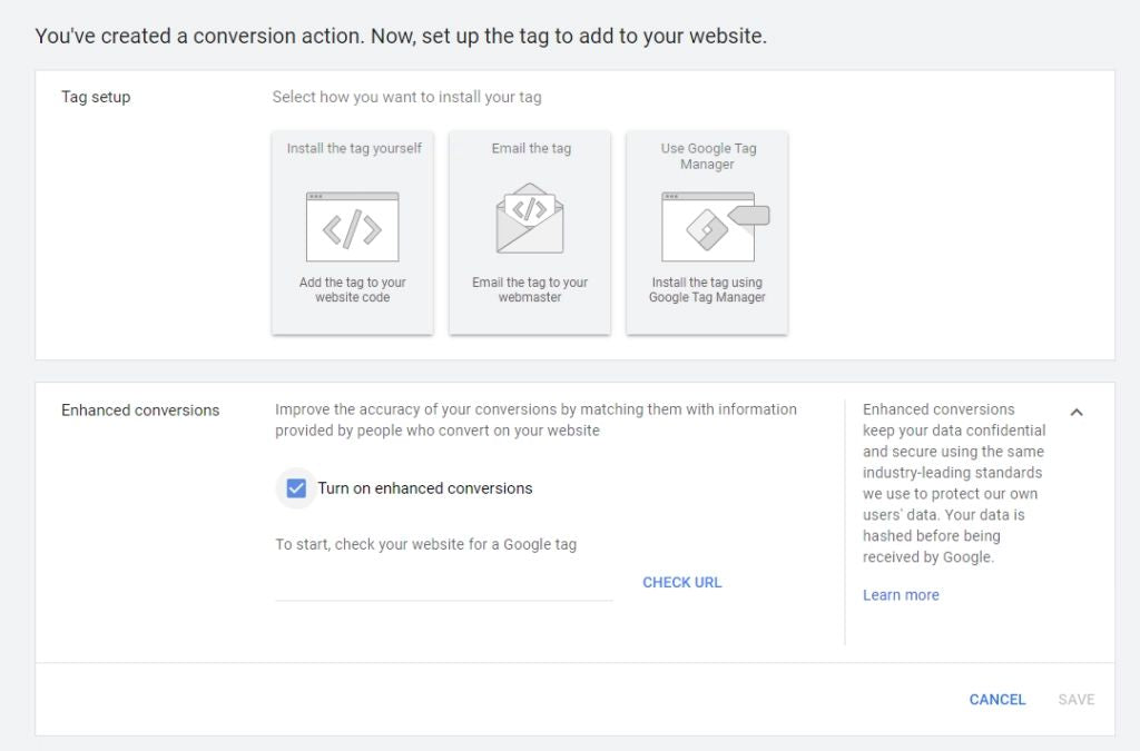 Next, check the box with Turn on enhanced conversions. Then input your website URL and click Check URL.