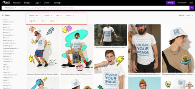 - Multiple templates: If you want to see your design on multiple photos at once (and download them instantaneously), you'll need to be a paid subscriber. Choose an apparel category from Placeit's mockup section: Then choose a sub-category – for example, ‘T-Shirts'. Then you can upload your design and select the product color for all the mockup photos on the page. After submitting your image and adjusting the color, you can download all the photos from the templates page rather than going into each template separately and downloading them.