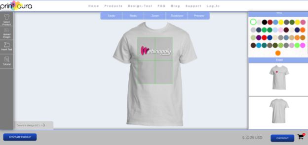 Print Aura allows you to create t-shirt mock-ups easily without the need for image-editing software. You start by picking a t-shirt brand, and from there, you can add your own design and colors like gray, red, blue, yellow, green, orange, etc. In terms of models, poses, and colors, it's a little limited, but it gets the job done.