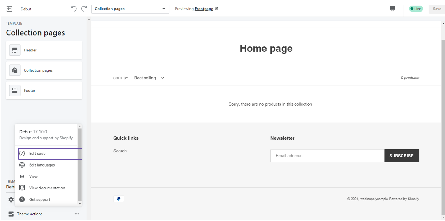 First, head to Online store, go to Themes from your Shopify dashboard. Choose the Customize button to be taken to the theme editing page. After that, choose Theme actions, then Edit code on your theme editing page to access the code of your own theme.
