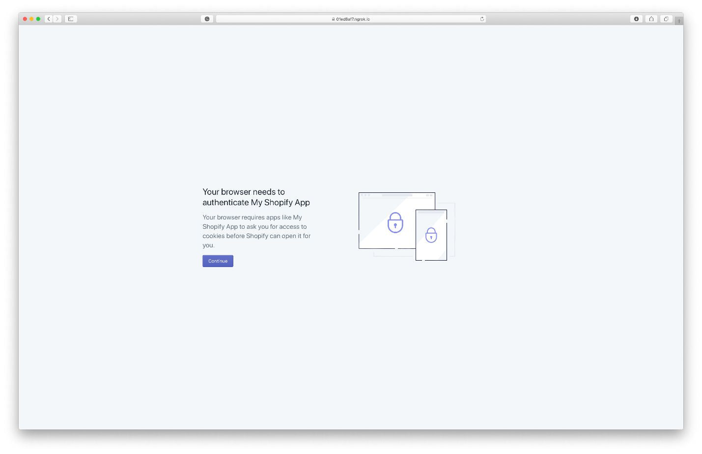 - Open the app via Shopify Admin on Safari 13.0.4. 8. This should show you the full-screen page with the message: "Your browser needs to authenticate My Shopify App".
