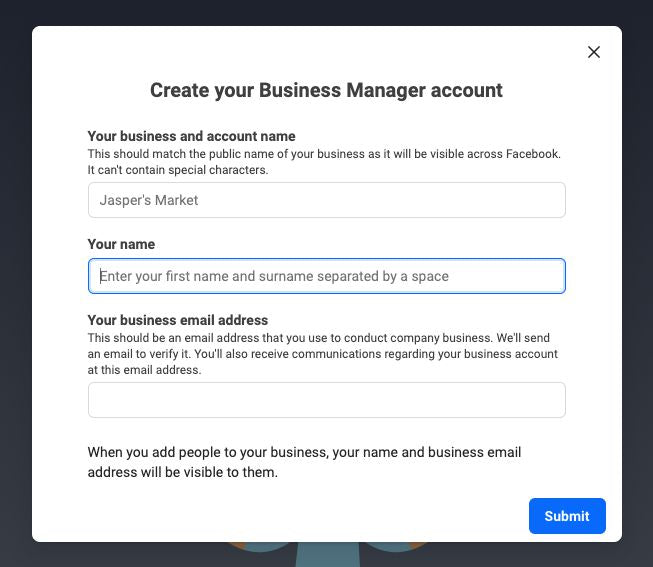 Enter your business details. After, you’ll need to specify whether this Business Manager account is for promoting your own business or to provide services to other businesses (like an agency). When you’re finished, click Submit.