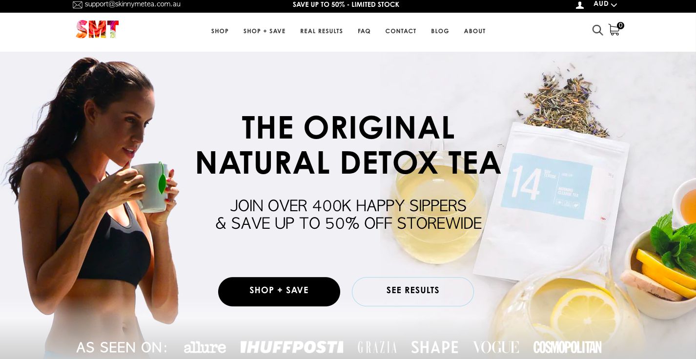 Let's take a closer look at the SkinnyMe Tea website, which is a Shopify brand in Australia.