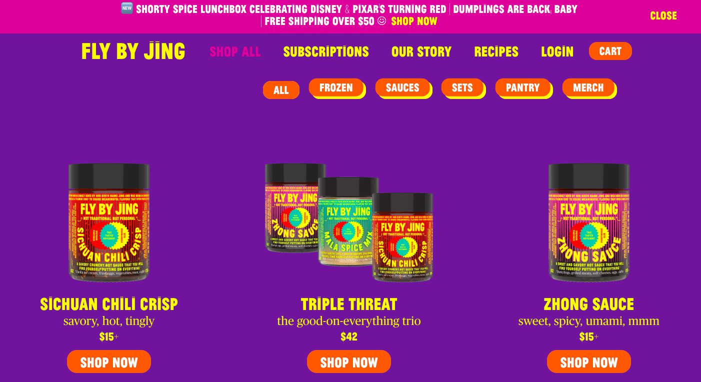 Not only does Fly By Jing have this awesome Sichuan chili crisp, they also have two other products to help you spice up your food: Mala Spice Mix and Zhong Sauce. The company was founded by Jing, who wanted to bring her authentic Chinese flavors to the world in a way that was approachable and exciting for everyone. We think she did a great job at doing just that, especially with the packaging—it's gorgeous! It features eye-catching graphics reminiscent of Asian sauces but is modernized to keep it fresh for today's customers. The website complements the beautiful packaging with fun colors and bold typography.