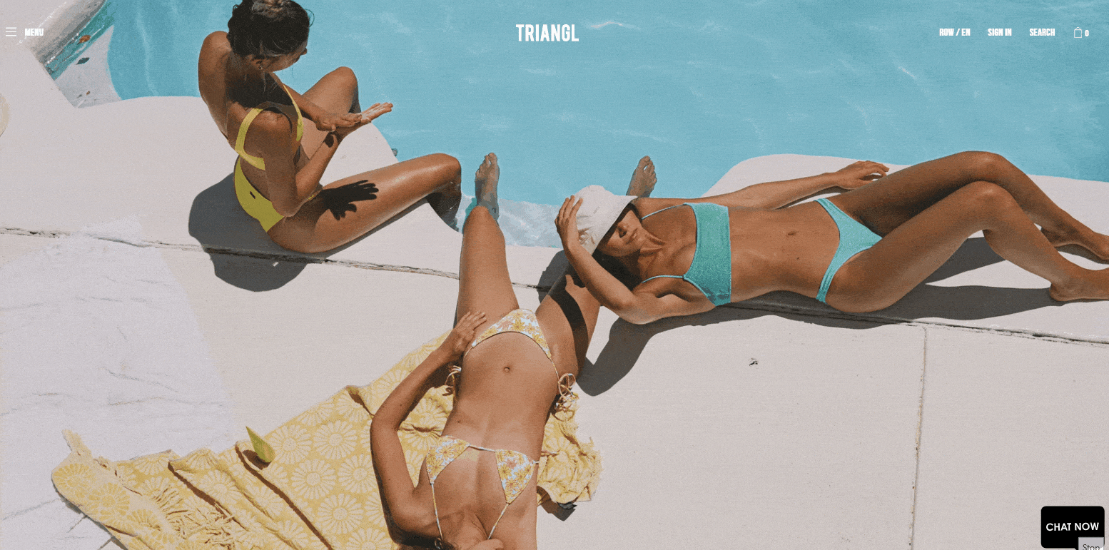Triangl is a popular bikini brand most known for its neoprene line. The brand’s website is simple and minimalistic. It feels like a summer lookbook which is appropriate and on point for their brand. The visuals are the highlight of their website even when you go to their product page. Just 3 items take up almost the whole screen so you immediately see the details of each product and when you hover, you instantly see how it looks when worn without having to click it which is a great feature for customers in this niche,