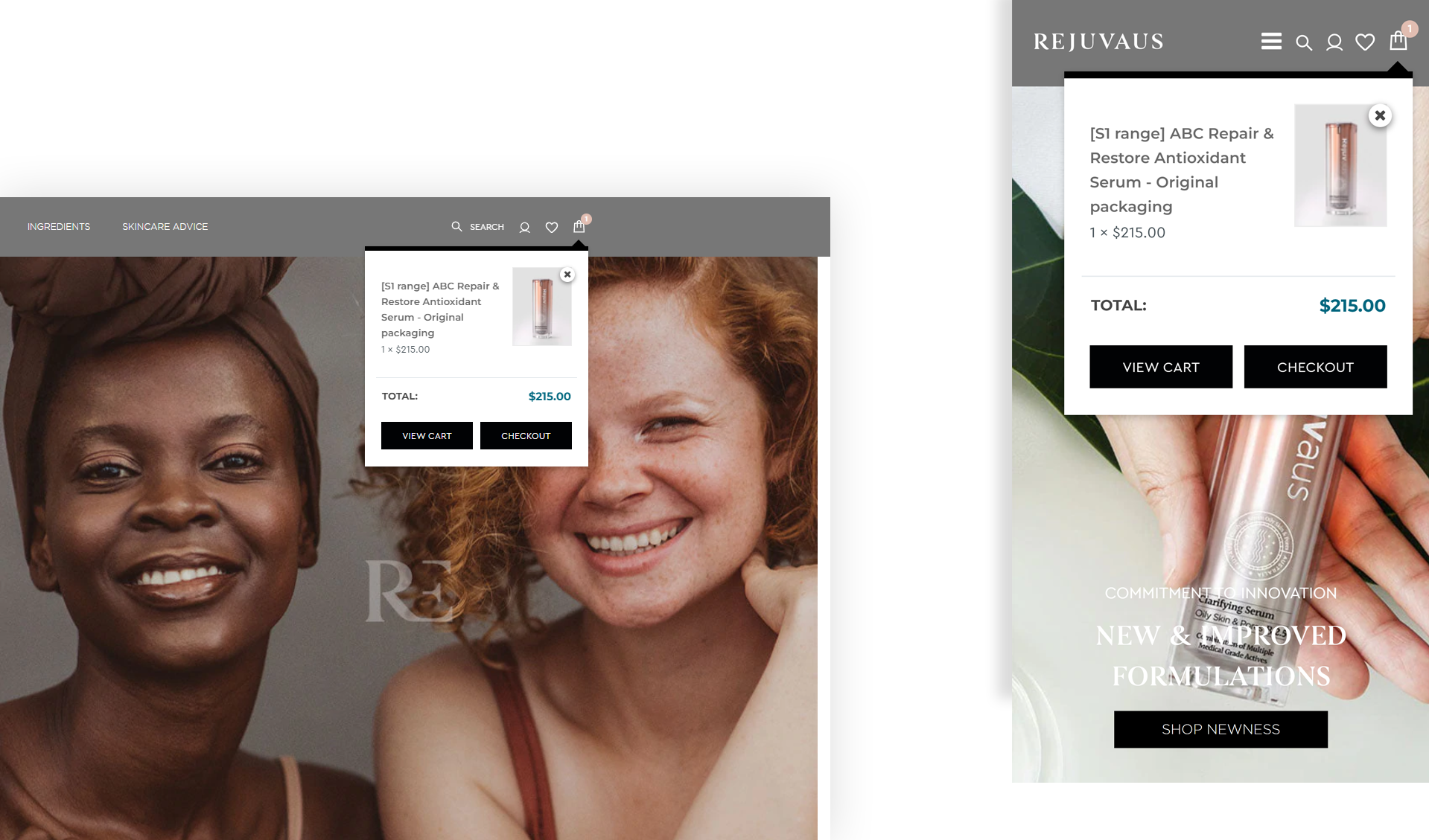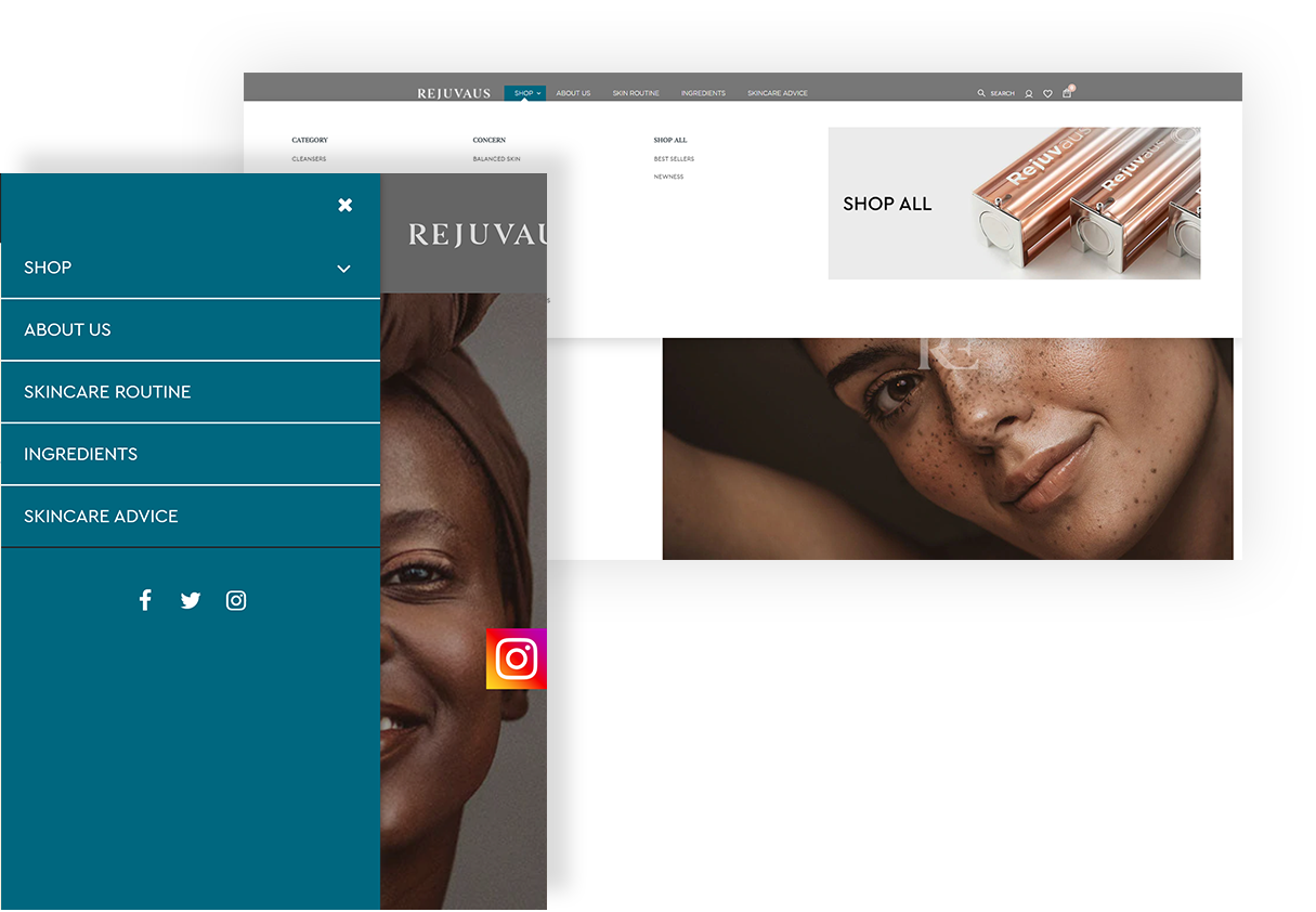 Sleek, stylish, and feminine. We designed the homepage around the concept of Rejuvaus' branding. The light and airy neutral color palette are accented with a pop of color that draws in the eye of any shopper. Our team also added several moving elements, such as a sweeping slider banner. Shoppers are greeted with a featured promotion. As you scroll down, you’ll find the benefits of Rejuvaus products highlighted by monochromatic CTA buttons designed to catch readers’ eyes.
