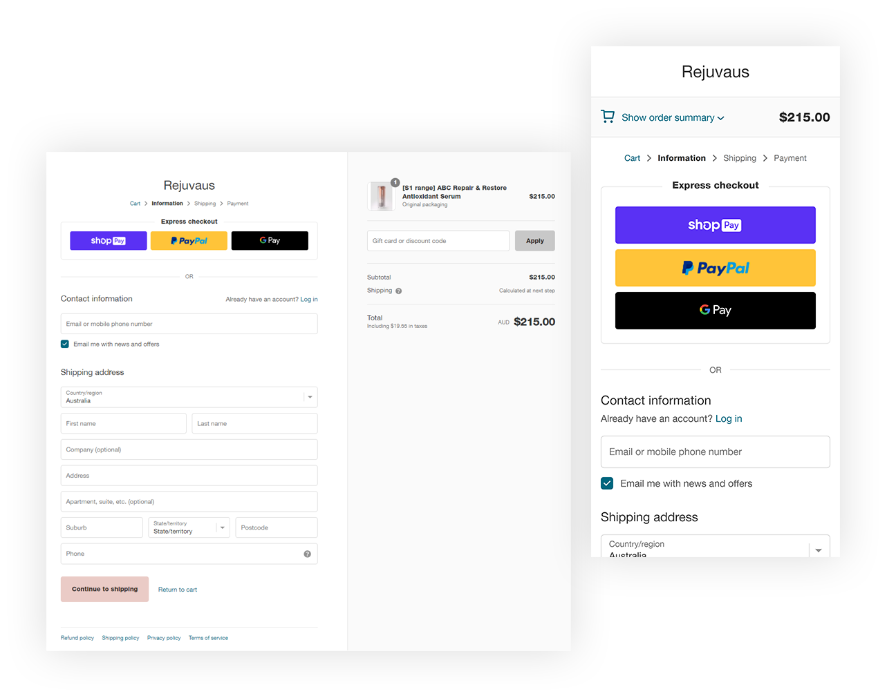 The checkout flow follows a simple 3-step process that begins with inputting your information, followed by filling out shipping information and finally moving on to payment. This simplified checkout process minimizes the time required to complete a purchase—effectively reducing abandoned carts.