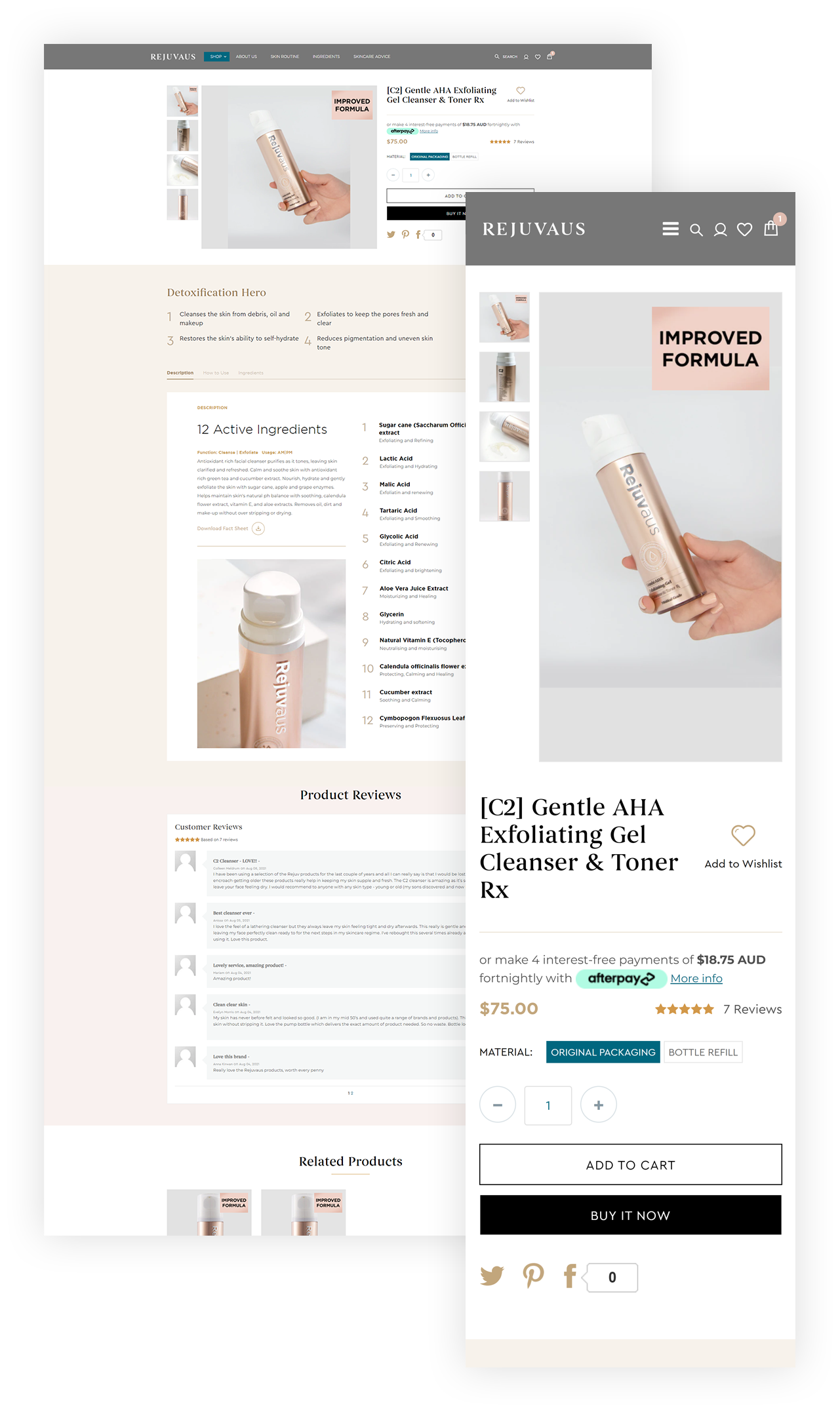 The Rejuvaus team approached us with the idea to build a brand new website on Shopify Shop 2.0 that would house their entire product catalog and offer a good e-commerce experience for their customers to increase sales. Together, we planned multiple customizations to ensure Rejuvaus can meet every one of their customer's needs.