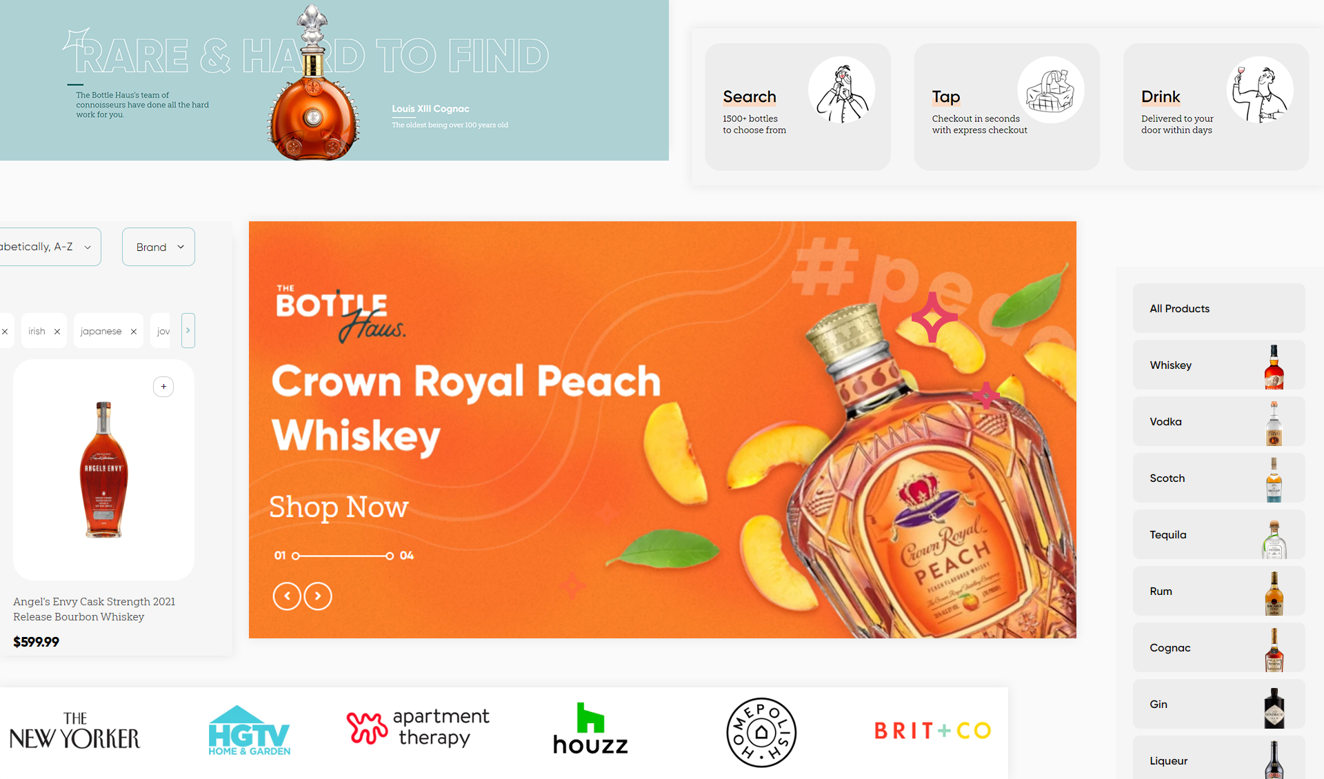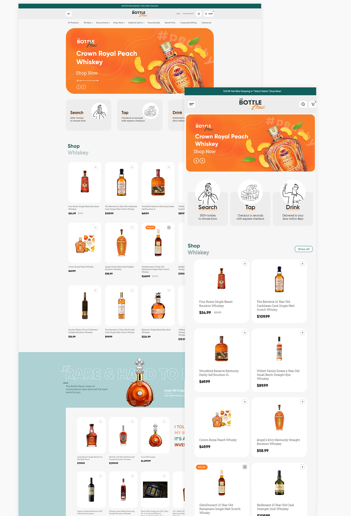 The home page features their best liquor collections, including their most popular beer and wine products. The navigation bar makes it easy for customers to find what they're looking for, whether that's a particular brand or type of alcohol or even just a specific bottle size.